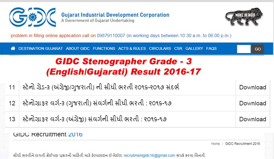 GIDC Stenographer Grade – 3 (English/Gujarati) Result 2016-17