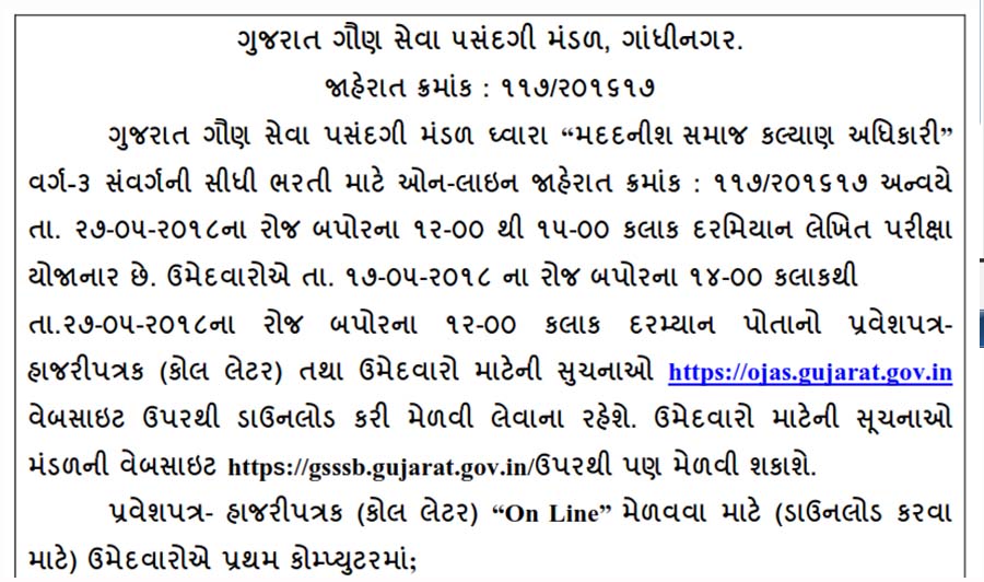 OJAS Call Letter 2018: All the employees in a government gsssb.gujarat.gov.inob would have written an entrance exam to get their job. Now Gujarat Gaun Seva Pasandgi Mandal – GSSSB published an official notification for Exam date & Call Letter Download for Assistant Social Welfare Officer (Advt. No. 117/2016-17) Post. you can view and download this exam Call Letter from OJAS Official website and read notification in pdf format by below mentioned link. This Exam scheduled on 27/05/2018 by GSSSB.