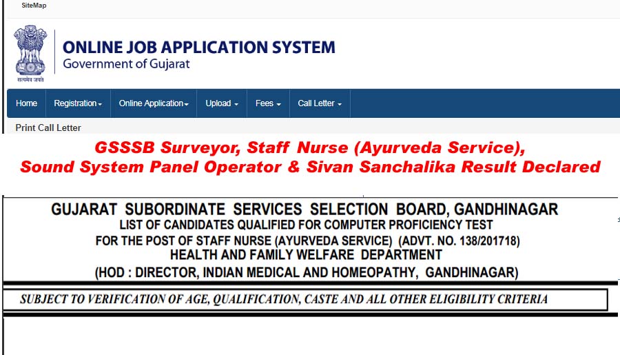 GSSSB Surveyor, Staff Nurse (Ayurveda Service), Sound System Panel Operator & Sivan Sanchalika Result Declared