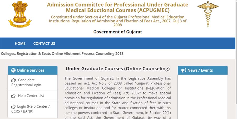 Gujarat Medical Admission Official Registration on Admission Committee for Professional Under Graduate Medical Courses (ACPUGMEC) Constituted under Section 4 of the Gujarat Professional Medical Education Institutions, Regulation of Admission and Fixation of Fees Act., 2007, Guj.3 of 2008, Government of Gujarat, Gandhinagar