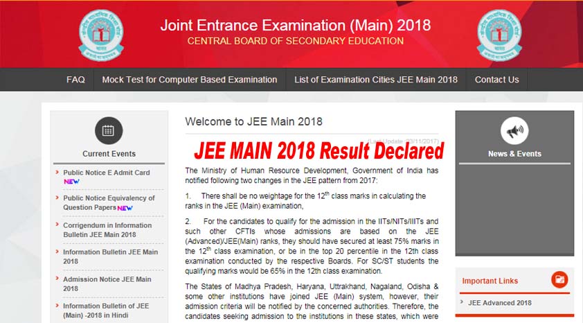 NEW DELHI: CBSE JEE Main Result 2018 Declared: JEE main result 2018: The result has been declared for both online and offline exams. Unlike last year, this year the board has released the result of both papers on the same day. JEE main is held every year for admission to engineering and architecture courses in NITs, IITs and other CFTIs. It is also an entry exam for JEE Advanced. The top 224000 candidates from JEE Main 2018 will be considered qualified for appearing in JEE Advanced 2018 exam. JEE Advanced is conducted for admission to IITs.