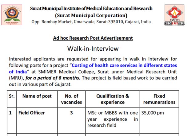 Interview Venue: College Council, D- BLOCK, Umarwada, SMIMER, Surat.